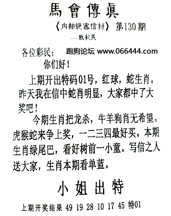 130期:{跑狗论坛}平特一尾<05-15-25-35-45>长期跟踪,稳赚不赔! |