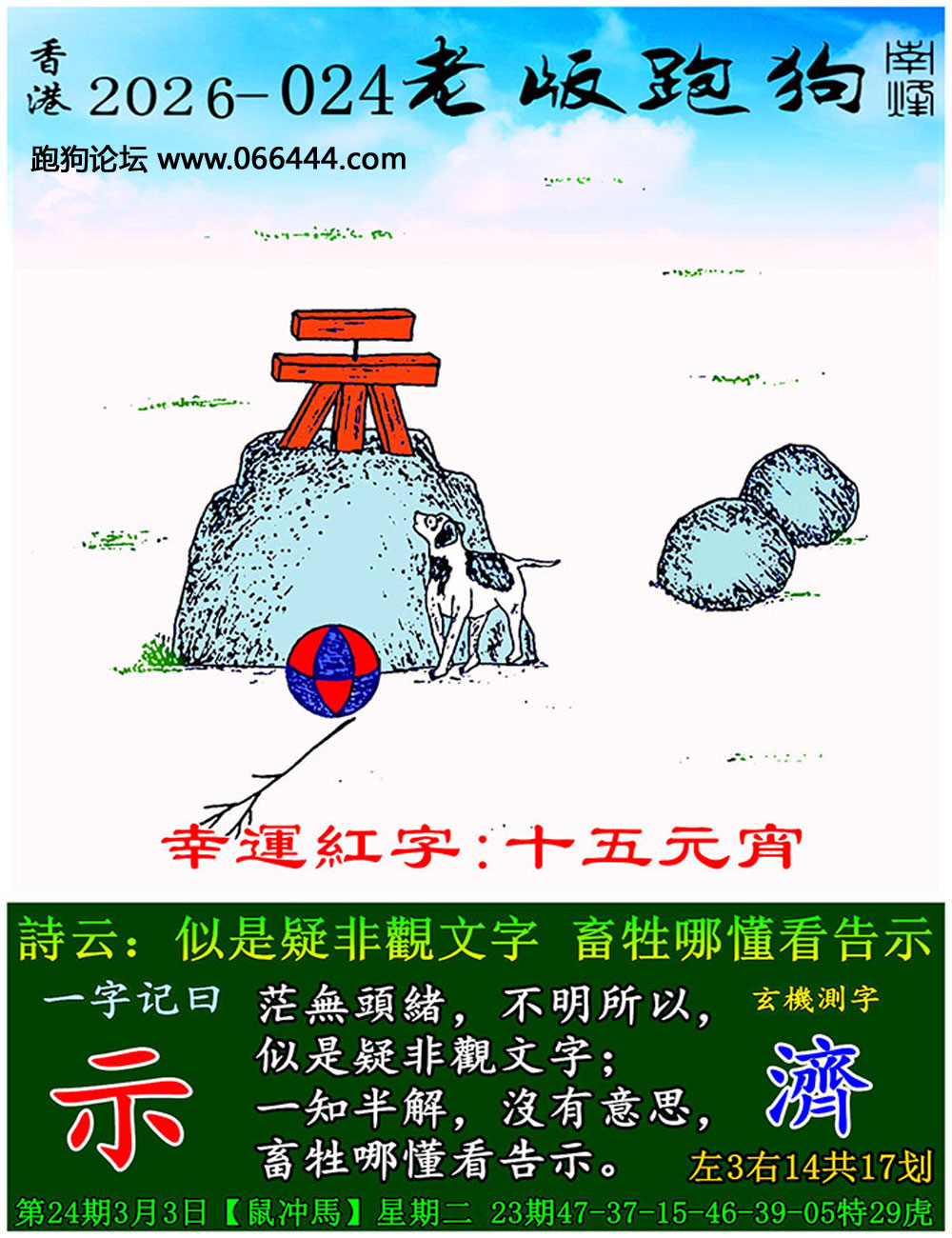 024期老版跑狗一字記之曰:【示】 詩雲:似是疑非觀文字,畜牲哪懂看告示。 茫無頭緒,不明所以,似是疑非觀文字; 一知半解,沒有意思,畜牲哪懂看告示。 玄機測字:《濟》