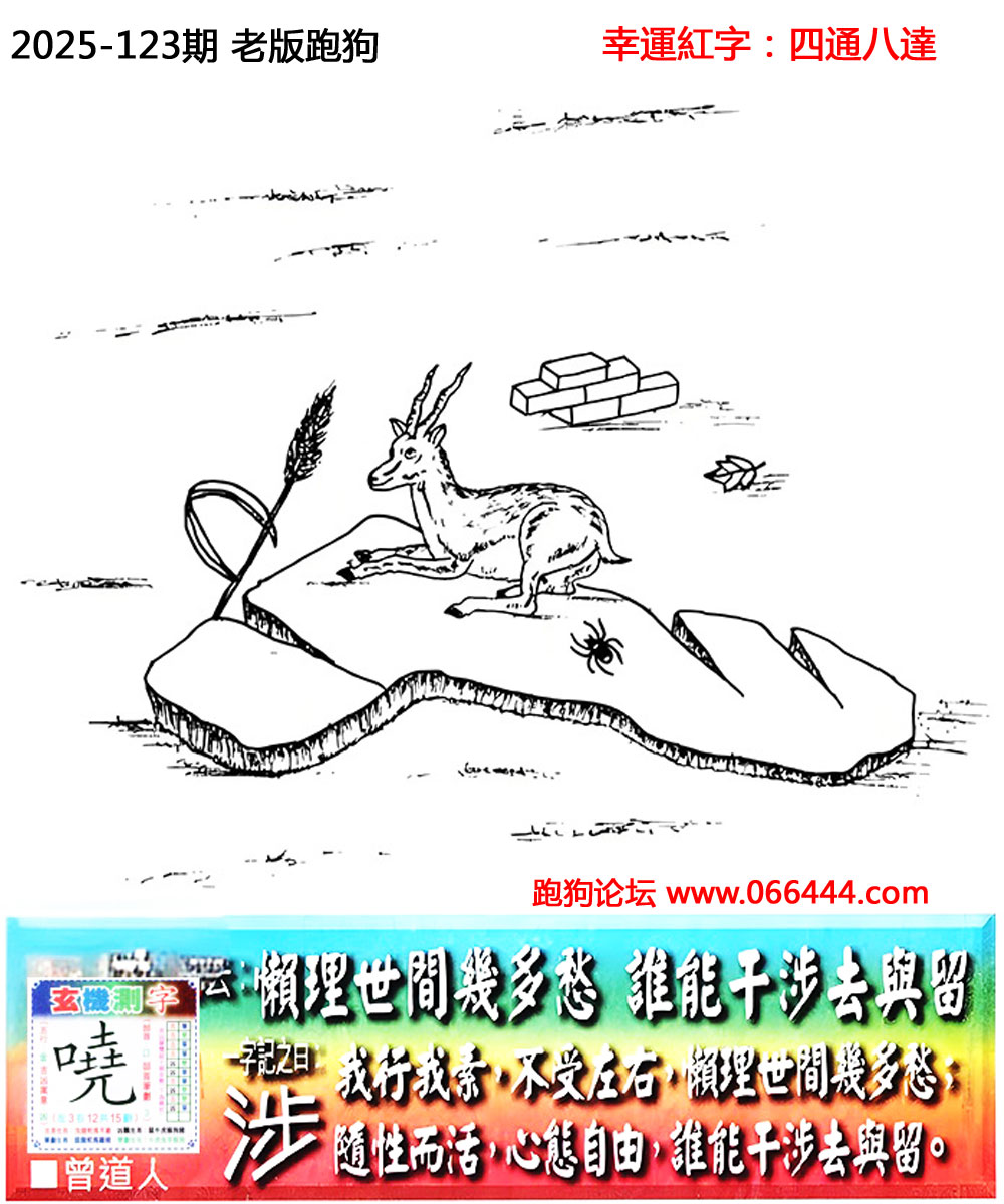123期老版跑狗一字記之曰:【涉】 詩雲:懶理世間幾多愁,誰能干涉去與留。 我行我素,不受左右,懶理世間幾多愁; 隨性而活,心態自由,誰能干涉去與留。 玄機測字:《嘵》