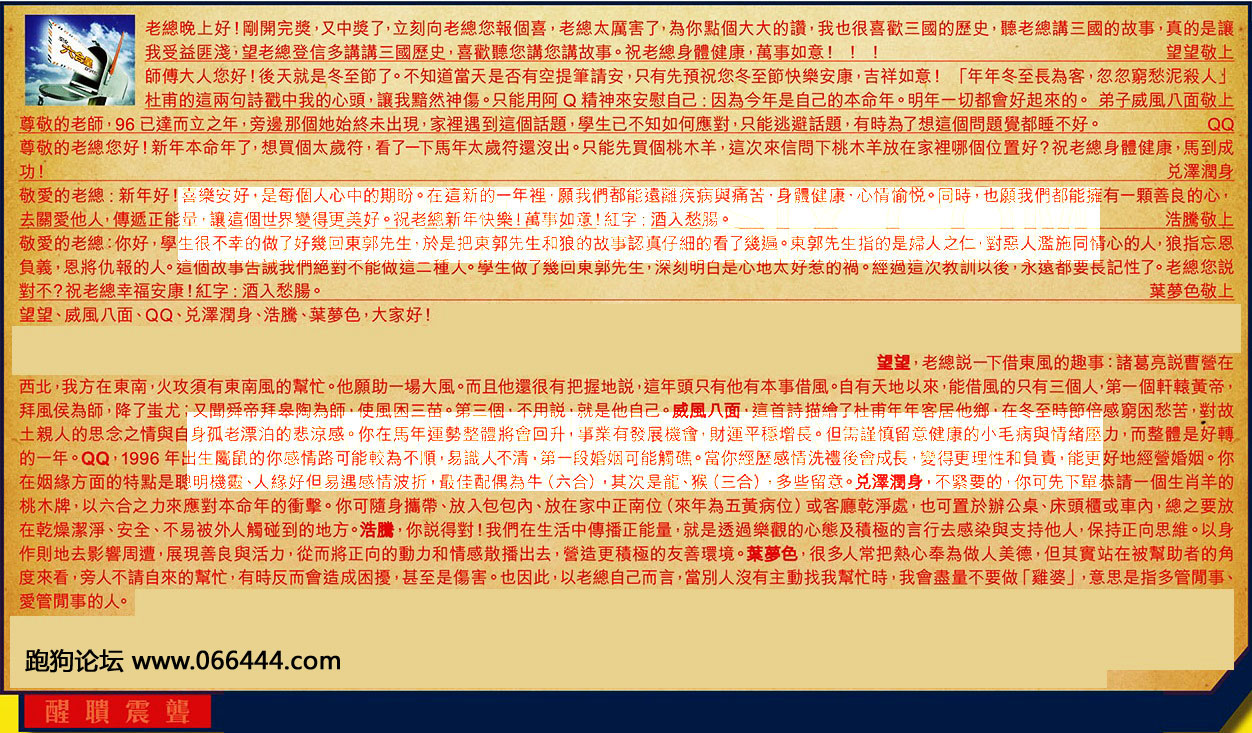 【1】.老總晚上好!剛開完獎,又中獎了,立刻向老總您報個喜,老總太厲害了,為你點個大大的讃,我也很喜歡三國的歷史,聽老總講三國的故事,真的是讓我受益匪淺,望老總登信多講講三國歷史,喜歡聽您講您講故事。祝老總身體健康,萬事如意!!!